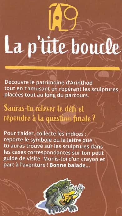 Tino, crapaud sonneur à ventre jaune se réveille loin de sa marre dans le bourg d’Arinthod. Il cherche son chemin pour rentrer et va demander de l’aide à des animaux de la ville. Ces animaux vont le guider d’un point à un autre et tout au long du parcours l’enfant doit inscrire sur son plan (flyer jeu) les lettres disséminées sur les modules scénographiques (sculpture en pierre, en bois etc). A la fin du parcours l’enfant doit remettre les lettres dans le bon ordre et trouve ainsi le lieu précis où il doit se rendre… et de là, Tino pourra repartir vers sa marre.
