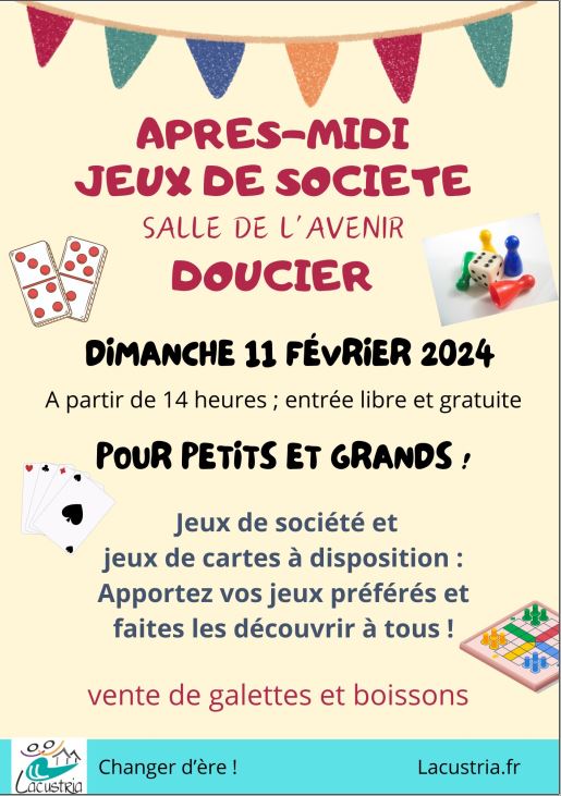Après-midi jeux de société à la salle de l'avenir à Doucier le dimanche 11 février à partir 14h. Entrée libre et gratuite pour petits et grands.