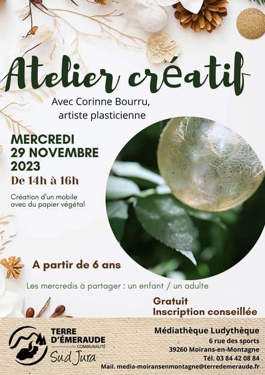 Atelier créatif le mercredi 29 Novembre 2023 de 14 h à 16 h à Médiathèque Terre d’Émeraude de Moirans-en-Montagne. Création d'un mobile avec du papier végétal avec Corinne BOURRU, artiste plasticienne.