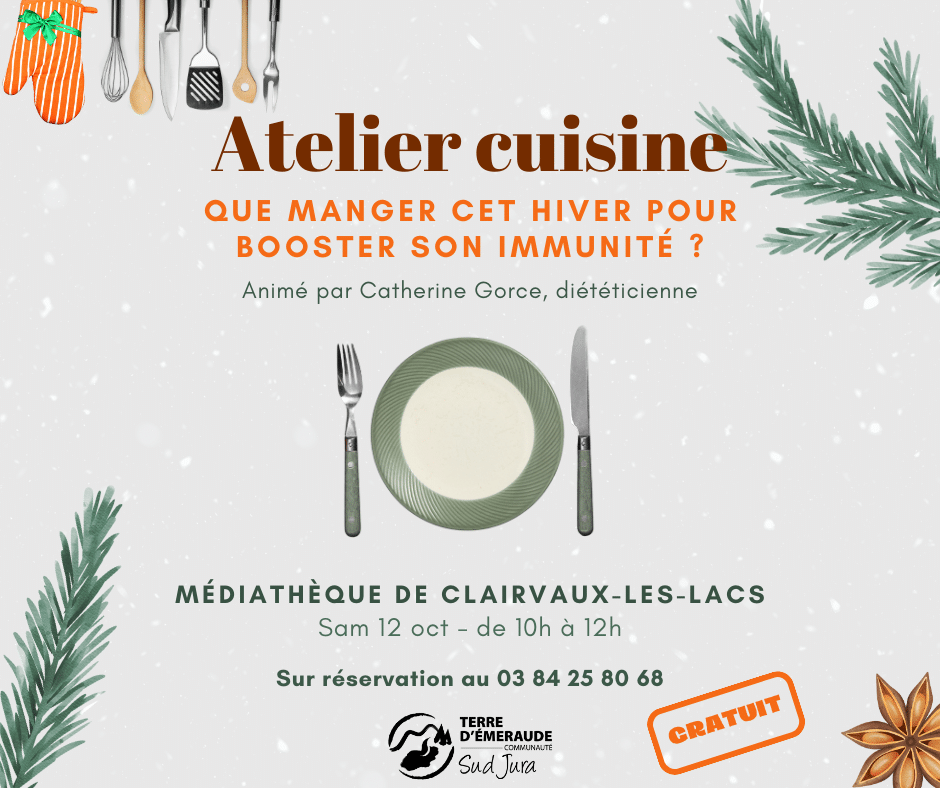 Atelier cuisine "Que manger cet hiver pour booster son immunité ?" le 12 octobre de 10h à 12h à la médiathèque de Clairvaux-les-Lacs.