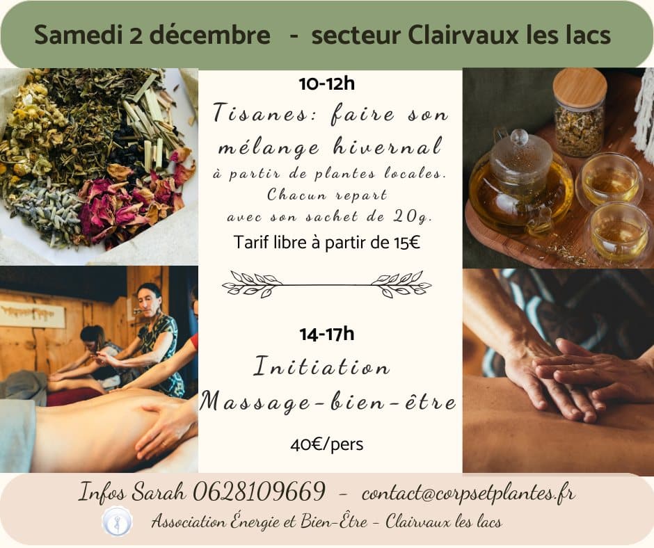 Atelier Plantes Médicinales de 10h à 12h : une occasion d’apprendre à réaliser une tisane hivernale respiratoire en réalisant un mélange de plantes sèches (plantes récoltées localement). Chacun repart avec son sachet de tisane, pour prendre soin de soi, ou pour offrir !