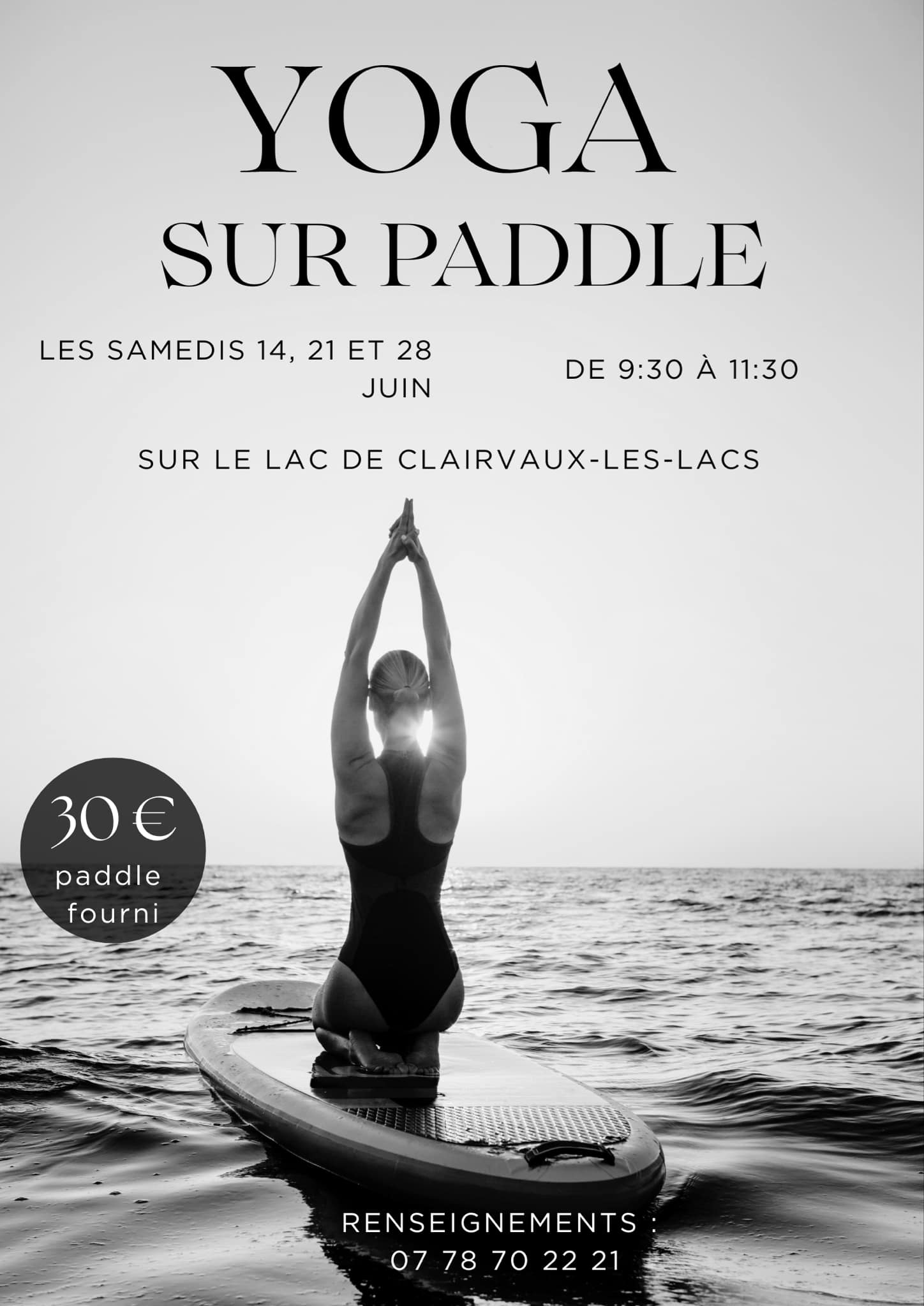 Yoga sur paddle au grand lac de Clairvaux-les-Lacs les samedis 14, 21 et 28 juin de 9h30 à 11h30.