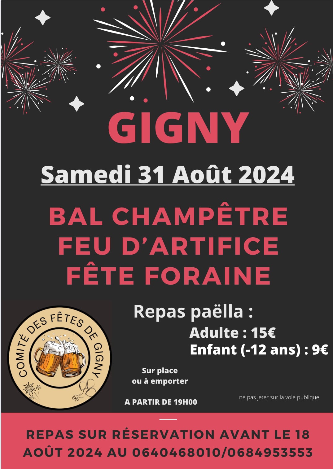Bal champêtre, feu d'artifice et fête foraine le 31 août à partir de 19h00. Repas paëlla sur place ou à emporter.