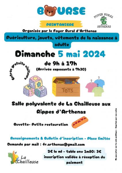 Bourse printanière le 5 mai de 9h00 à 17h00 à la salle polyvalente de la Chailleuse.