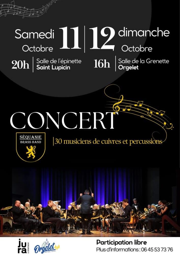 Concert comprenant 30 musiciens de cuivres et percussions le 11 et 12 octobre à 16h à la Grenette d'Orgelet.