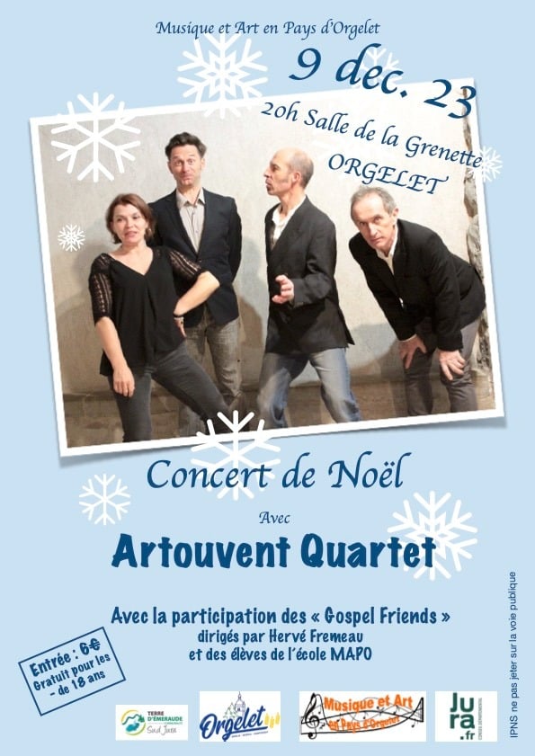 Ce concert vous proposera le fameux "Artouvent quartet" dont la 1ère partie sera assurée par les Gospel Friends dirigés par Hervé Fremeau, et quelques élèves de l'école MAPO.