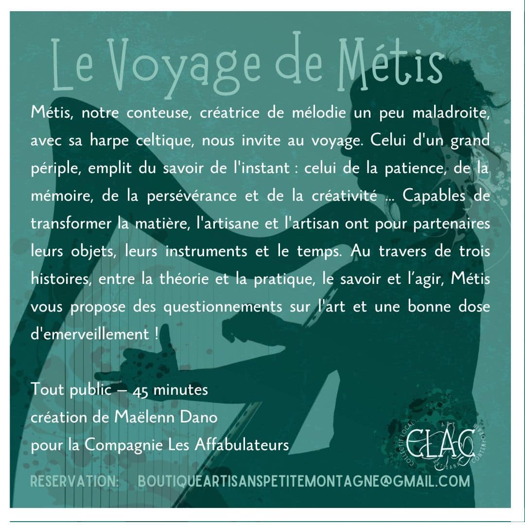 Métis, notre conteuse, créatrice de mélodie un peu maladroite, avec sa harpe celtique, nous invite au voyage. Celui d'un grand périple, emplit du savoir de l'instant : celui de la patience, de la mémoire, de la persévérance et de la créativité … Capables de transformer la matière, l'artisane et l'artisan ont pour partenaires leurs objets, leurs instruments et le temps. Au travers de trois histoires, entre la théorie et la pratique, le savoir et l’agir, Métis vous propose des questionnements sur l'art et une bonne dose d'émerveillement !