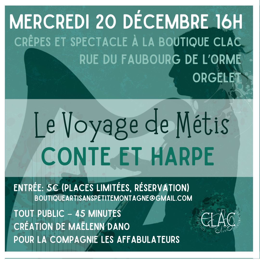 Conte et harpe le 20 décembre à 16h à la boutique des artisan·e·s de la Petite Montagne.