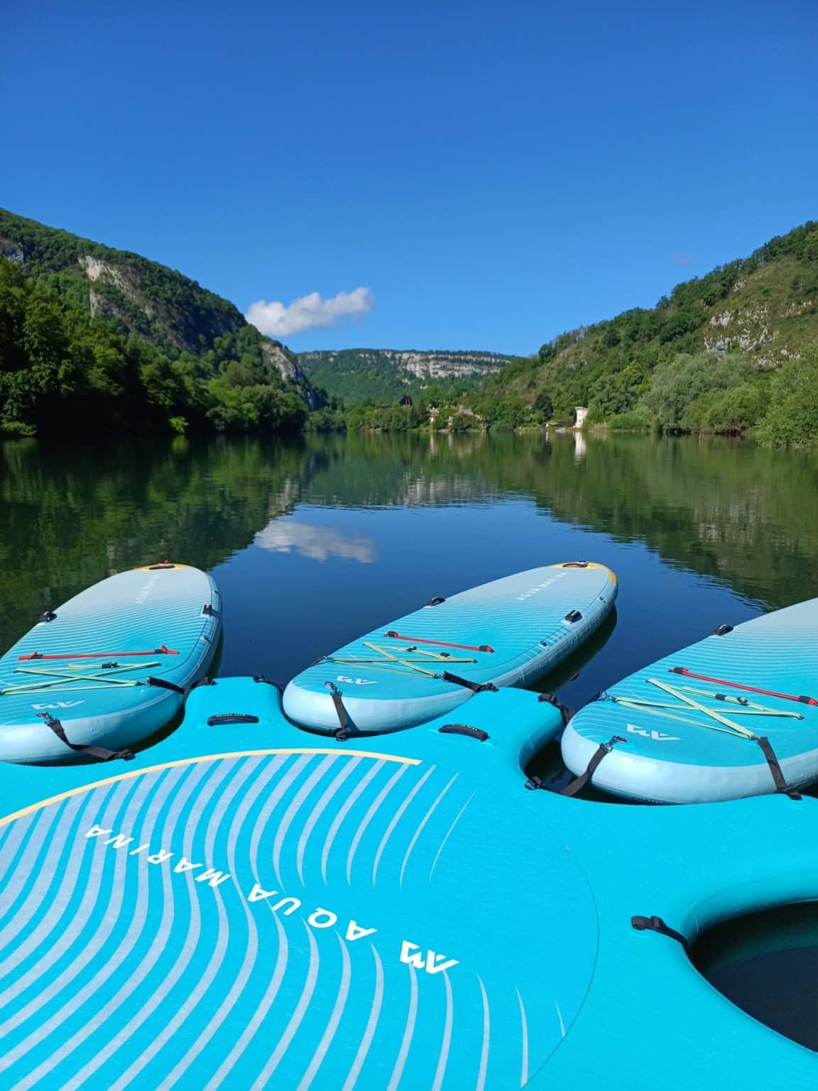 Séance de pilate sur paddle à la base de loisirs de Thoirette-Coisia. Organisée par l'Association l'Apasserelle.