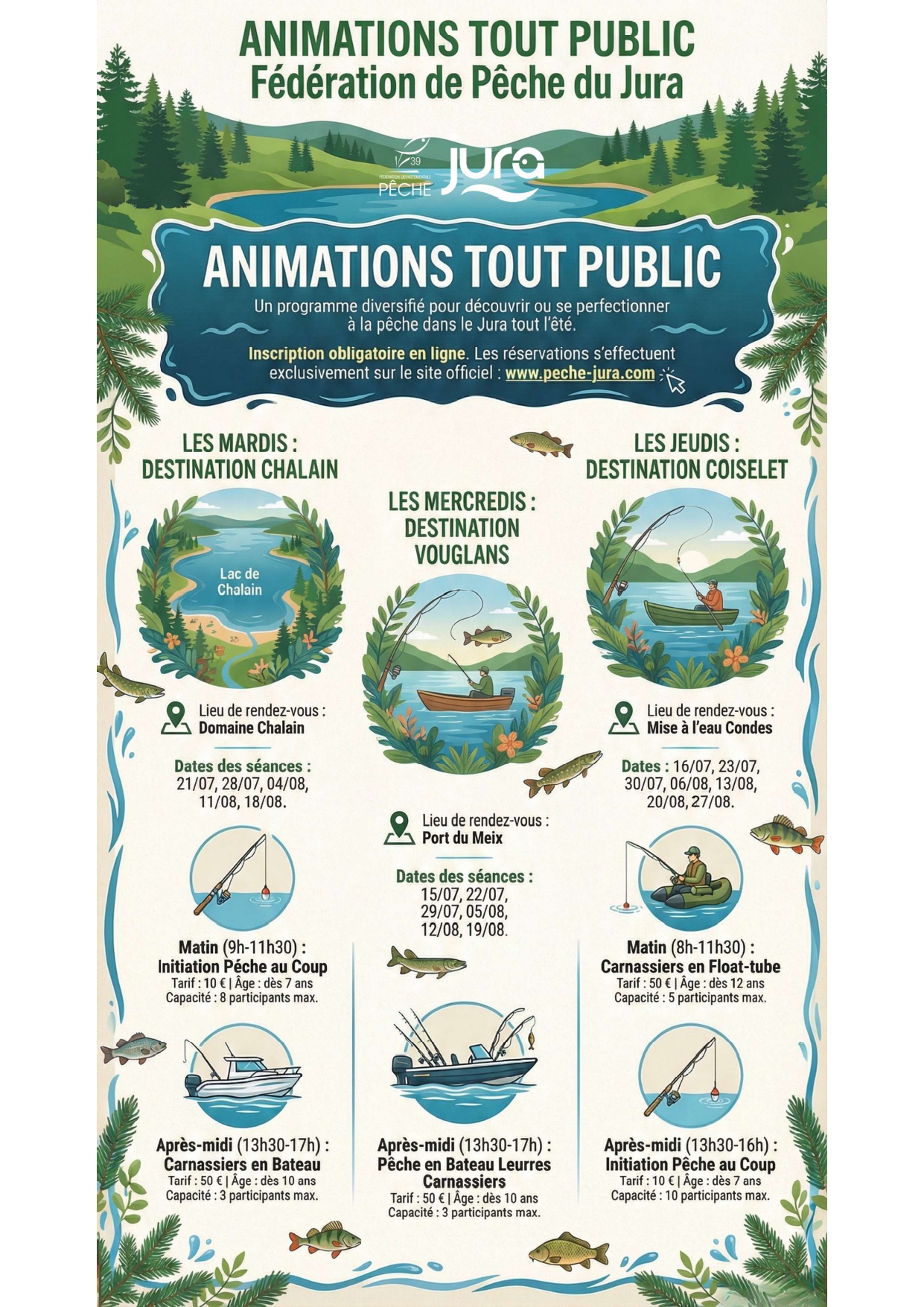 Gratuit, à partir de 8 ans et sur réservation au chalet de la fédération de pêche au Domaine de Chalain. Maximum 8 personnes par séance, enfants accompagnés des parents.