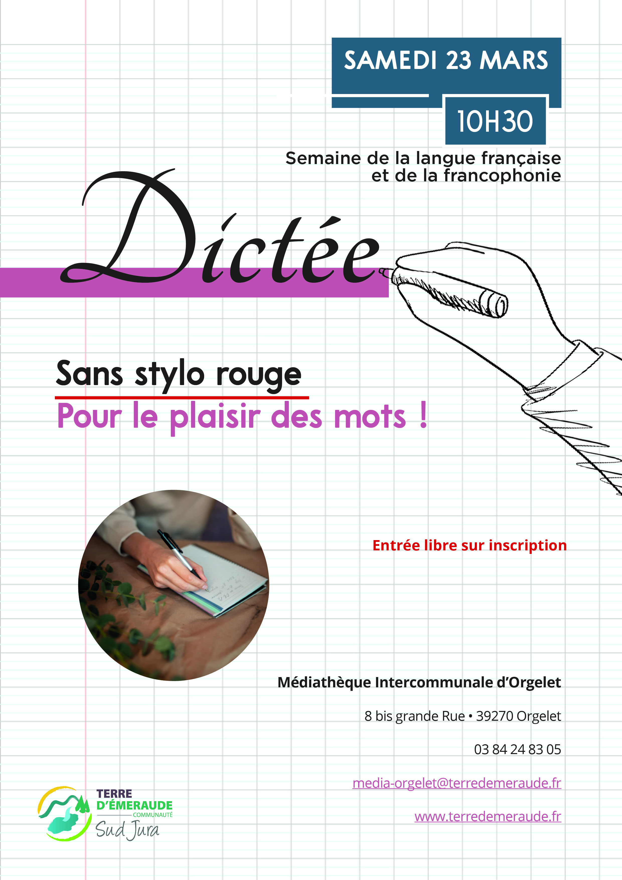Dictée le 23 mars à 10h30 à la médiathèque d'Orgelet. Entrée libre et sur inscription.