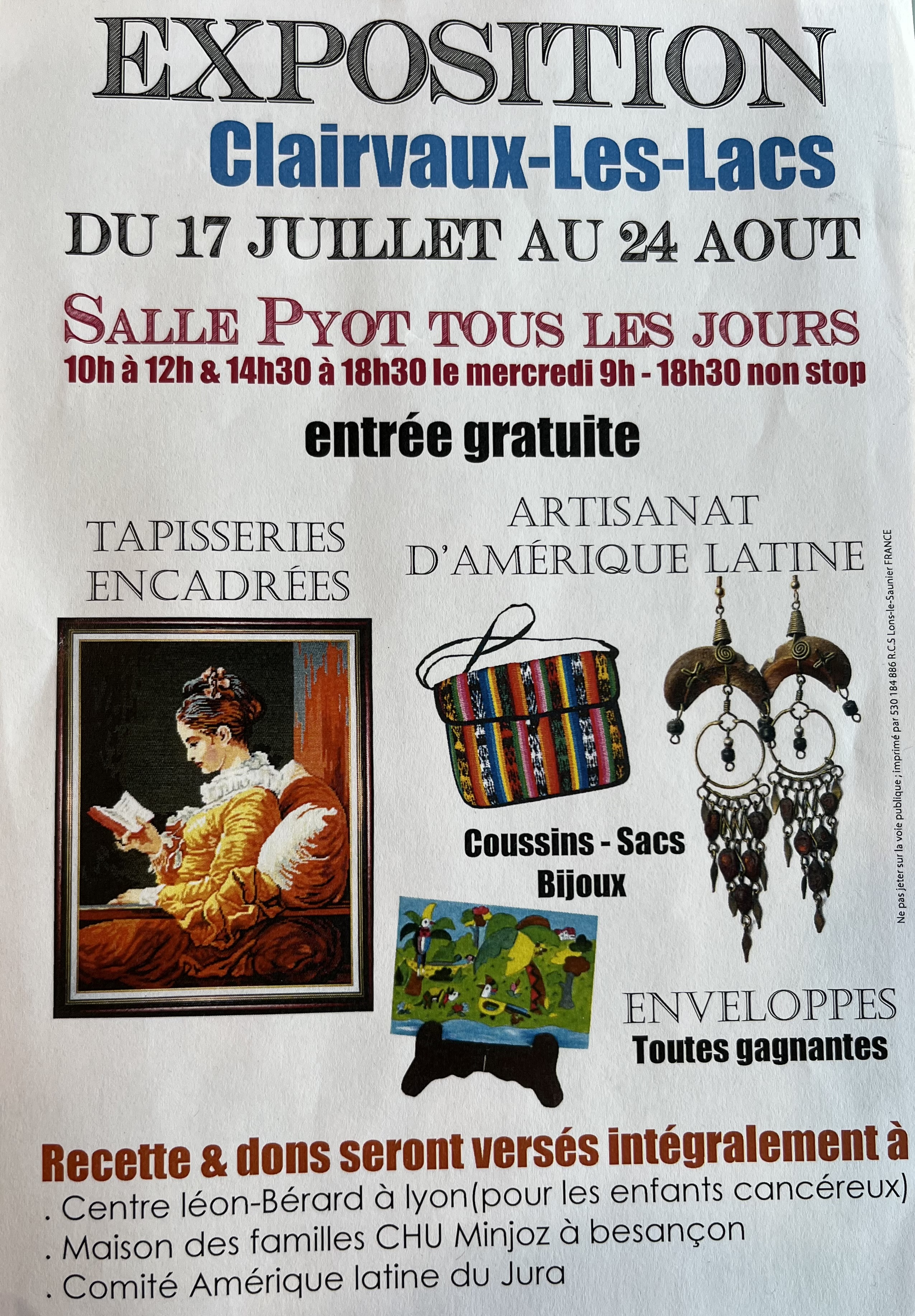 Exposition du 17 juillet au 24 août à la salle pyot de Clairvaux-les-Lacs, dans la cour de la mairie. Tous les jours de 10h à 12h et de 14h30 à 18h30 et le mercredi de 9h à 18h30 non stop.