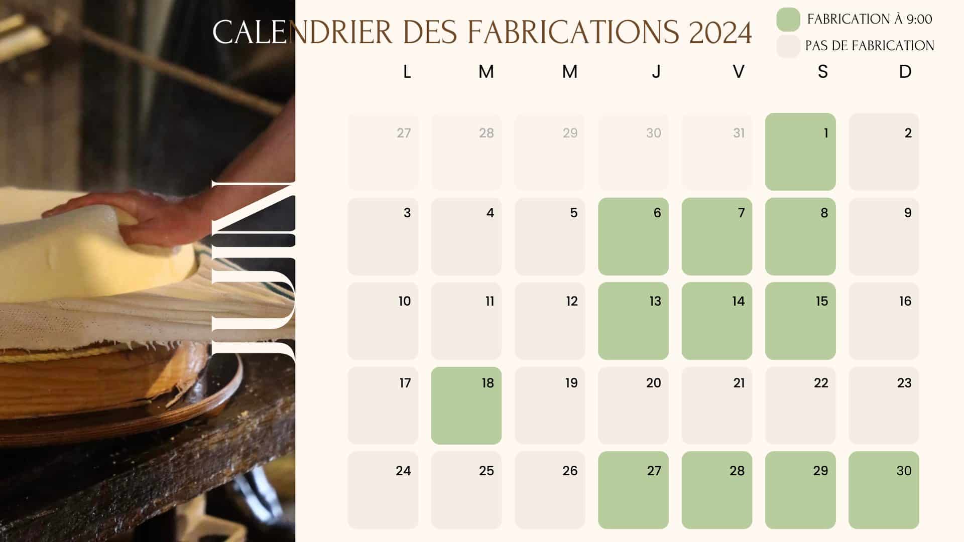 En juin, visite avec fabrication : le 1er, 06, 07, 08, 13, 14, 15, 18, 27 , 28, 29 et 30 juin.