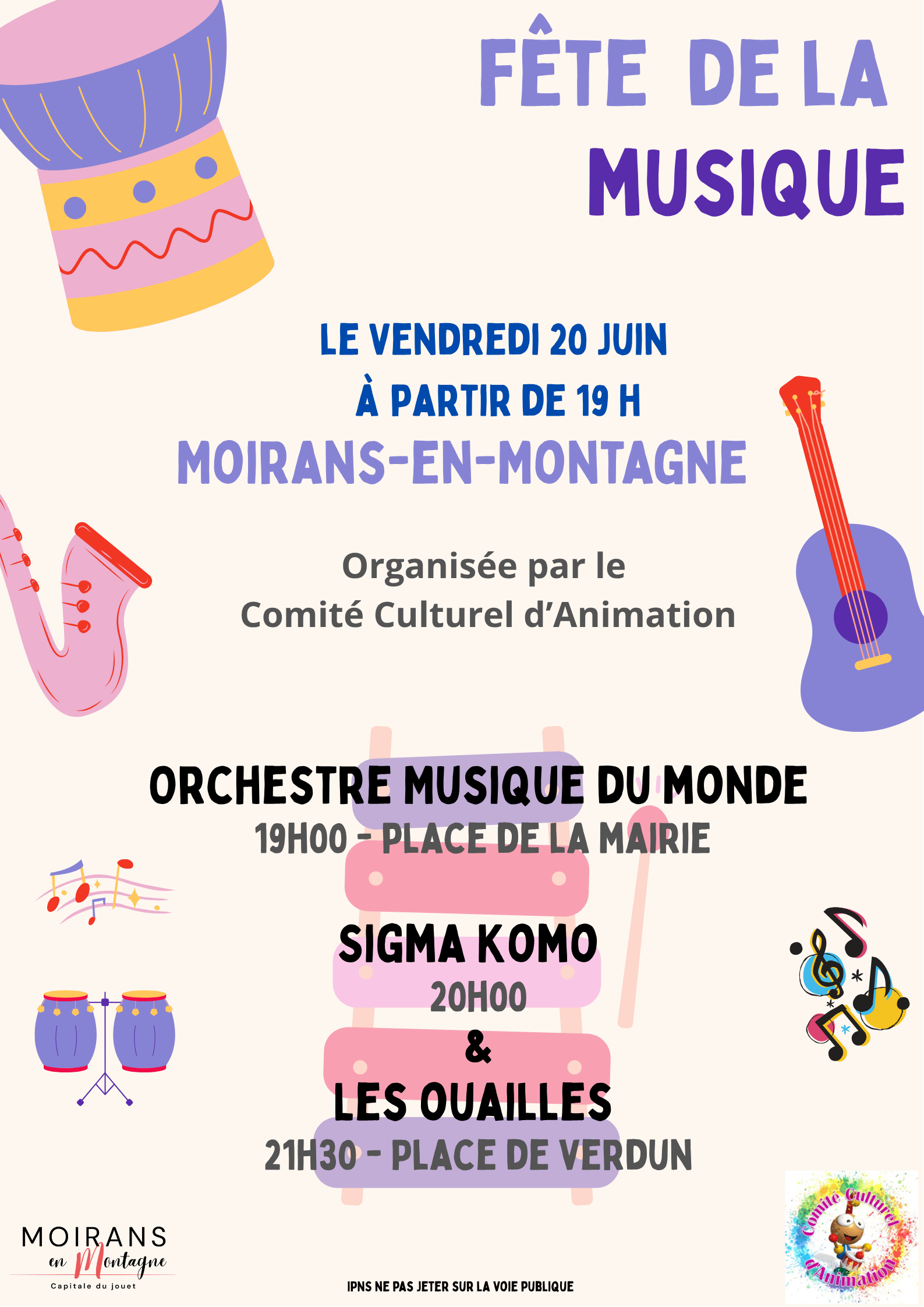 Fête de la musique le 20 juin à partir de 19h00 vers la mairie de Moirans-en-Montagne.