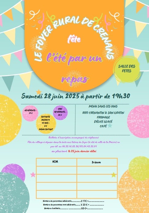 Fête de l'été le 28 juin à partir de 19h30 à la salle des fêtes de Crenans.