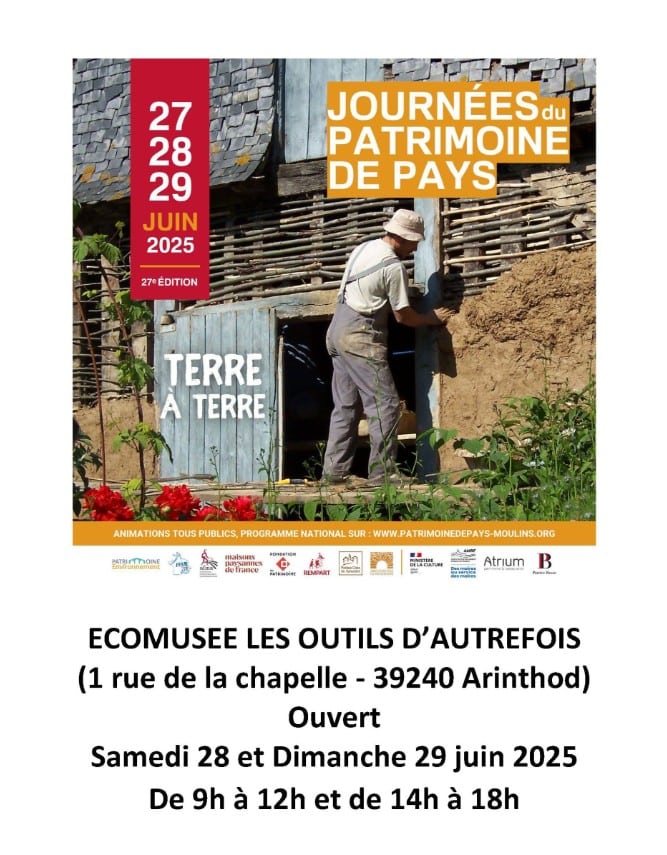Journées du patrimoine de pays et des moulins le 27, 28 et 29 juin à l'Écomusée des Outils d'Autrefois.
