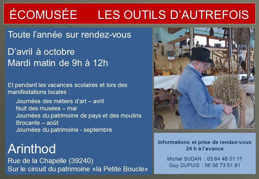 A l'occasion des Journées du Patrimoine de Pays et des Moulins, venez découvrir l'écomusée afin de faire revivre les outils ou objets qui jadis partageaient la vie simple et laborieuse de la Petite Montagne (sud du Jura) et principalement l'eau et ses usages (lessive, tournerie ....).