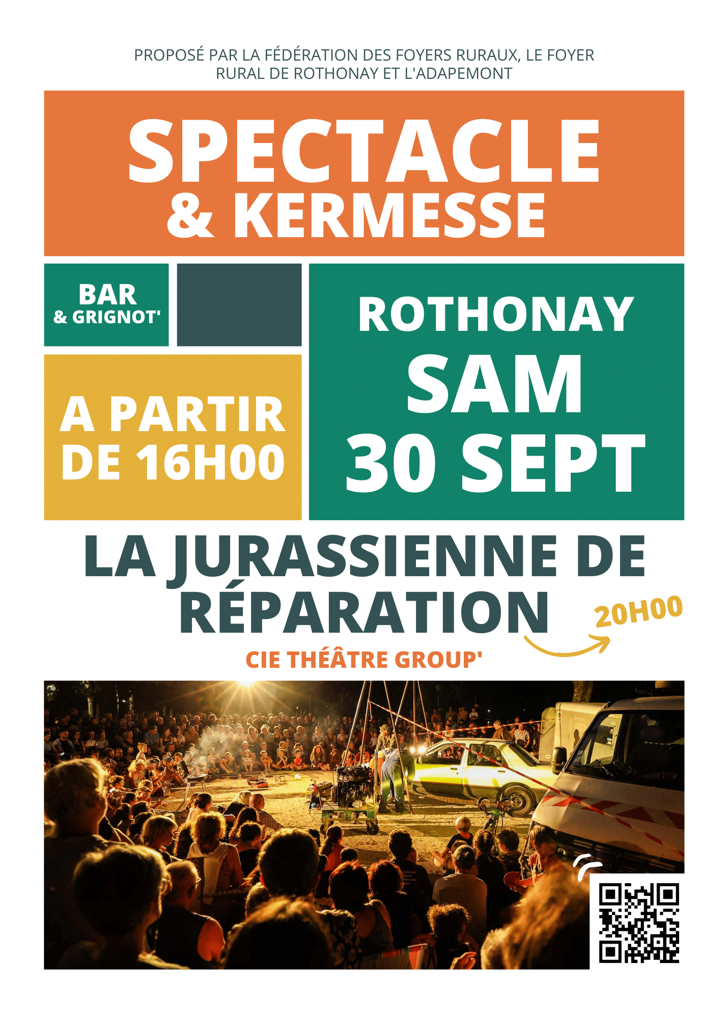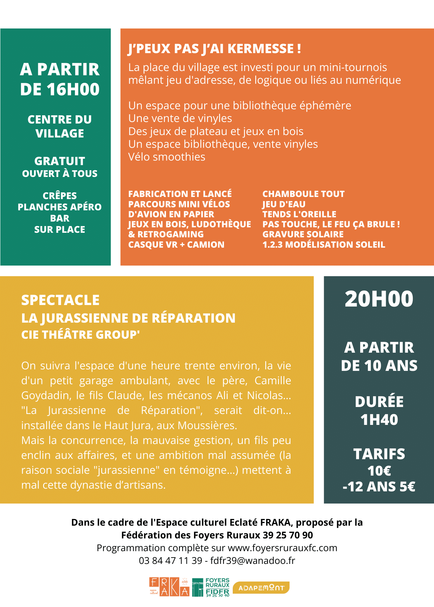 Spectacle de théâtre « La Jurassienne de Réparation » à 20h. La pièce raconte les aventures d'un petit garage ambulant dans le Haut Jura. Accessible à partir de 10 ans.