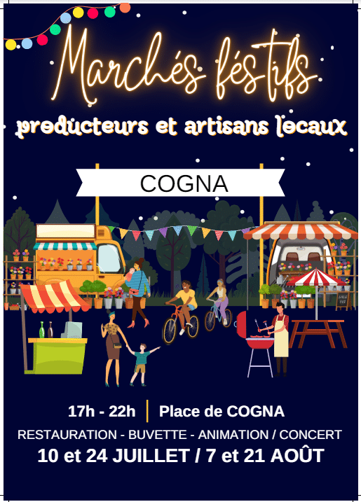Marché nocturne d'artisans et de producteurs locaux à Cogna. Animations sur la place du village : ambiance conviviale et festive.