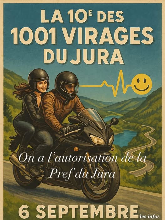 Balade en moto sur les belles routes du Jura, encadrer par des motocyclistes et voitures.