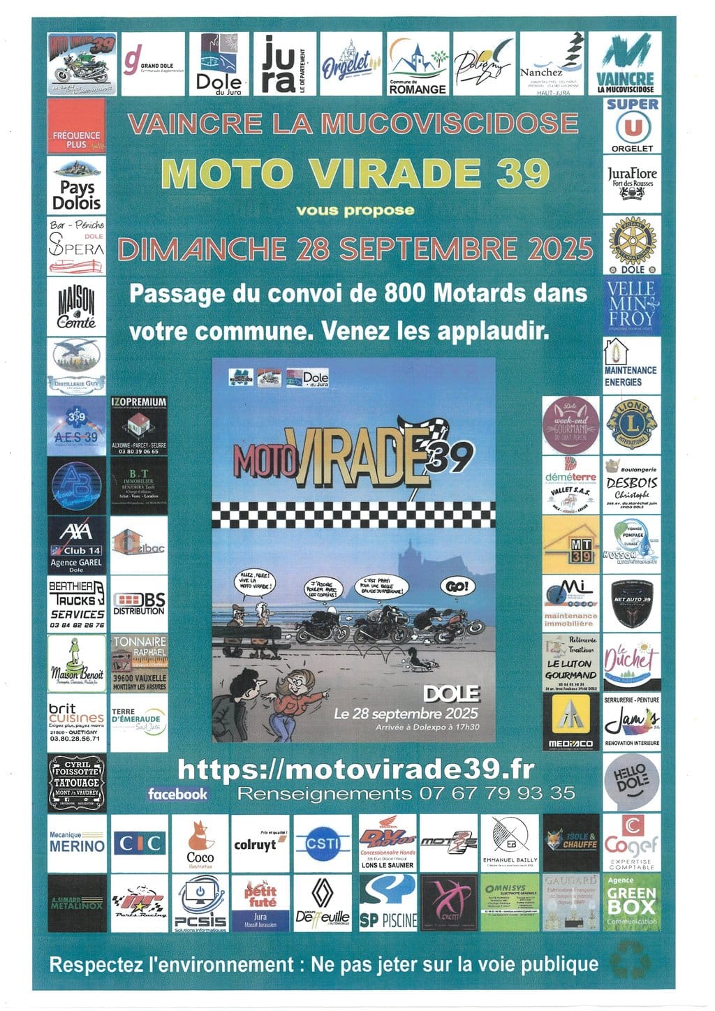 Moto Virade 2025 le dimanche 28 septembre, passage sur la Commune entre 14h00 et 15h00 au rond-point.