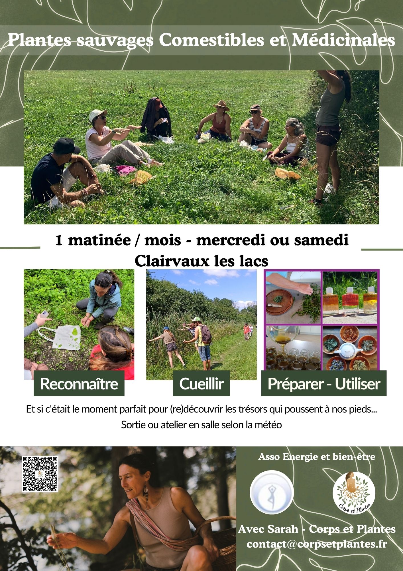 Sarah vous emmène le temps d'une matinée par mois un mercredi ou samedi, en balade autour de Clairvaux-les-Lacs, à la rencontre des plantes sauvages comestibles, médicinales… et même parfois toxiques (histoire de bien les reconnaître et de ne pas se tromper !).