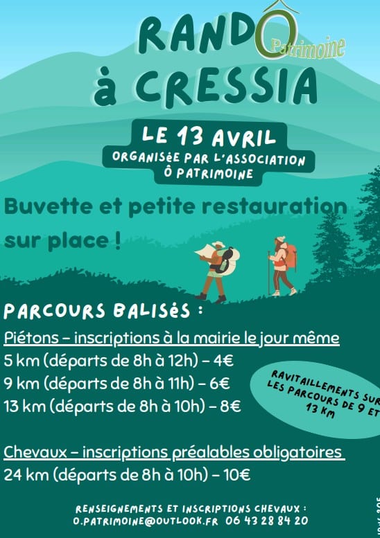 Randonnée à départ de la mairie de Cressia le 13 avril à partir de 8h00.