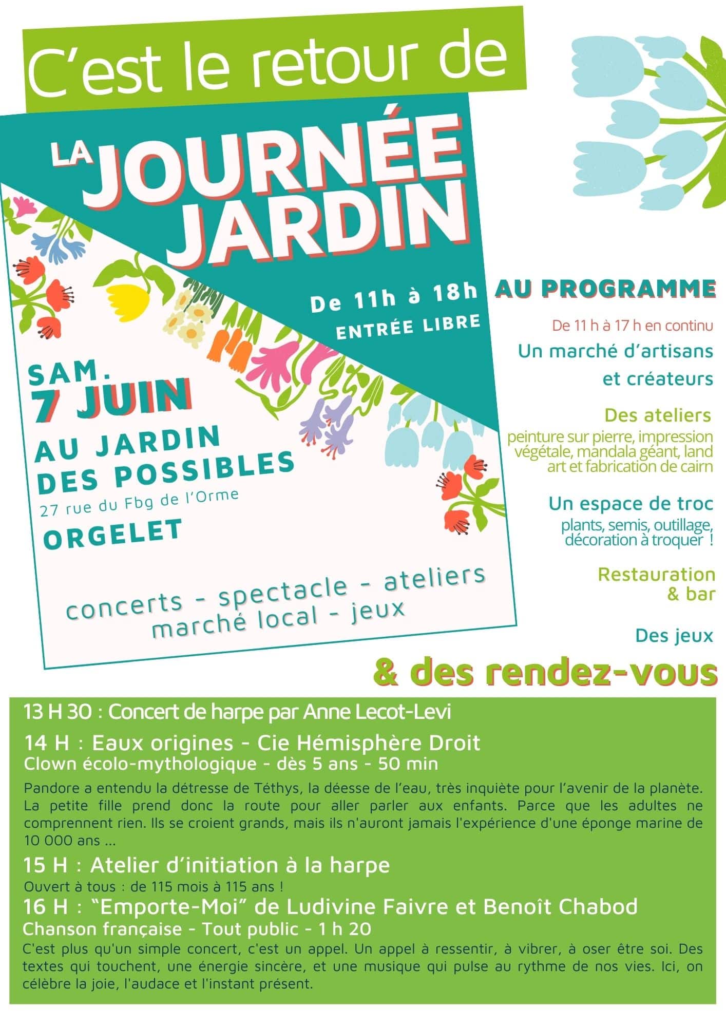 Au programme, des ateliers, un marché d'artistes et artisans, des jeux, un spectacle, de la musique et des visites du jardin. Tout au long de la journée, vous pourrez profiter de ce lieu accueillant et convivial dans une ambiance festive, musicale et de découverte. Et c'est aussi le moment pour troquer plantes, semis, outillage et déco. Apportez ce que vous souhaitez échanger.