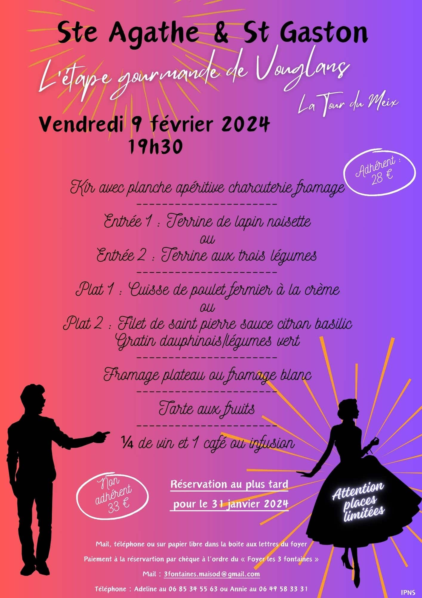 Réservation par mail, téléphone jusqu'au 31 janvier. Paiement à la réservation par chèque à l'ordre "Foyer les 3 Fontaines" .