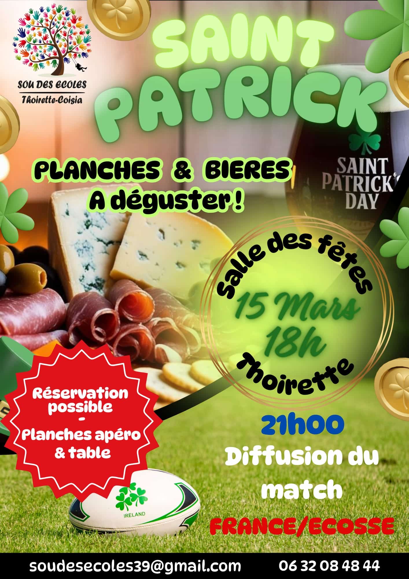 Saint Patrick le 15 mars à partir de 18h00 à la salle des fêtes de Thoirette-Coisia. Organisé par le Sou des Écoles de Thoirette-Coisia.