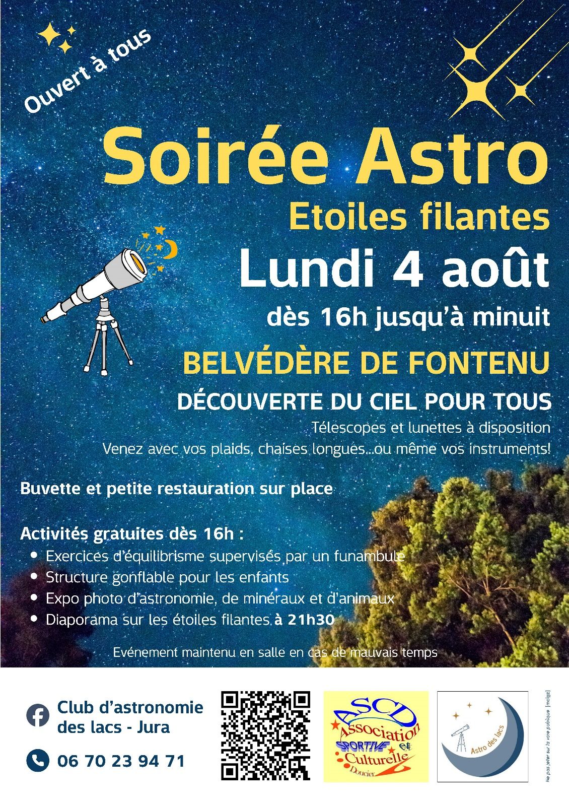 Activités gratuites dès 16h : exercice d'équilibrisme supervisés par un funambule, structure gonflable pour les enfants, expo photo d'astronomie, de minéraux et d'animaux. Et diaporama sur les étoiles filantes à 21h30.