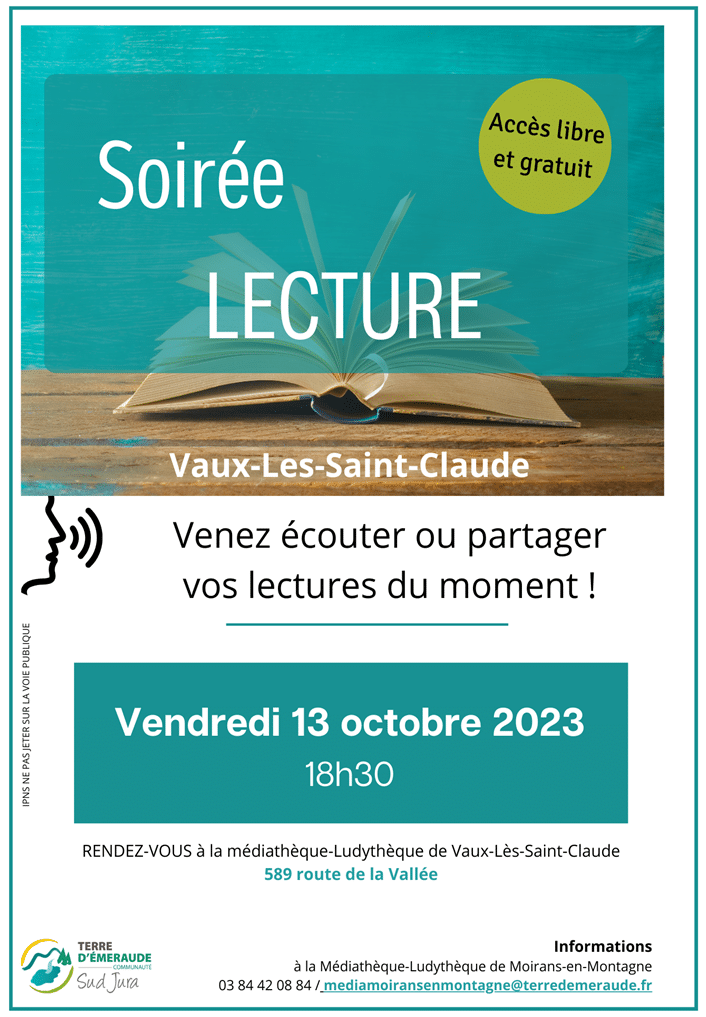 Rendez-vous à la médiathèque de Vaux-lès-Saint-Claude pour une « Soirée Lecture » le Vendredi 13 Octobre 2023 à 18 h 30.