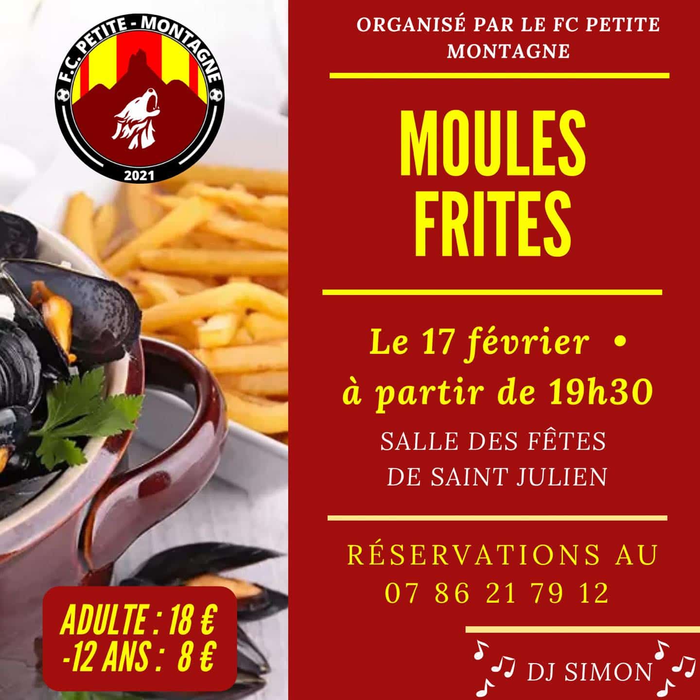 Soirée moules frites le 17 février à 19h30 à la salle des fêtes de Saint Julien. Réservation par téléphone. Animation musicale avec DJ Simon.