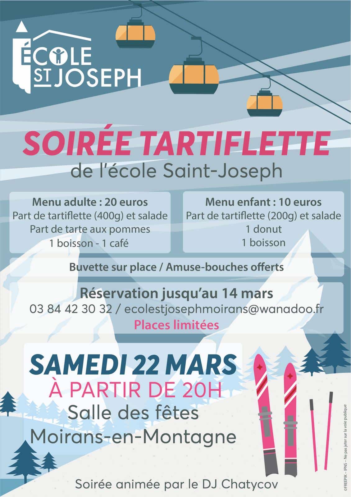 Soirée tartiflette le 22 mars à partir de 20h00 à la salle des fêtes de Moirans-en-Montagne.