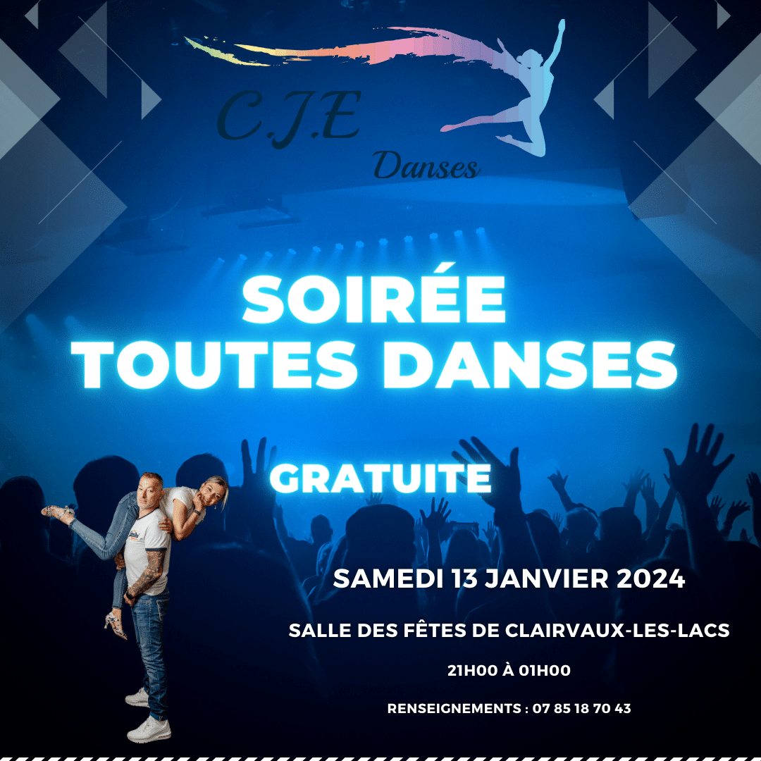 Soirée toutes danses le 13 janvier à la salle des fêtes de Clairvaux-les-Lacs. Entrée gratuite, de 21h00 à 01h00. Renseignement par téléphone.