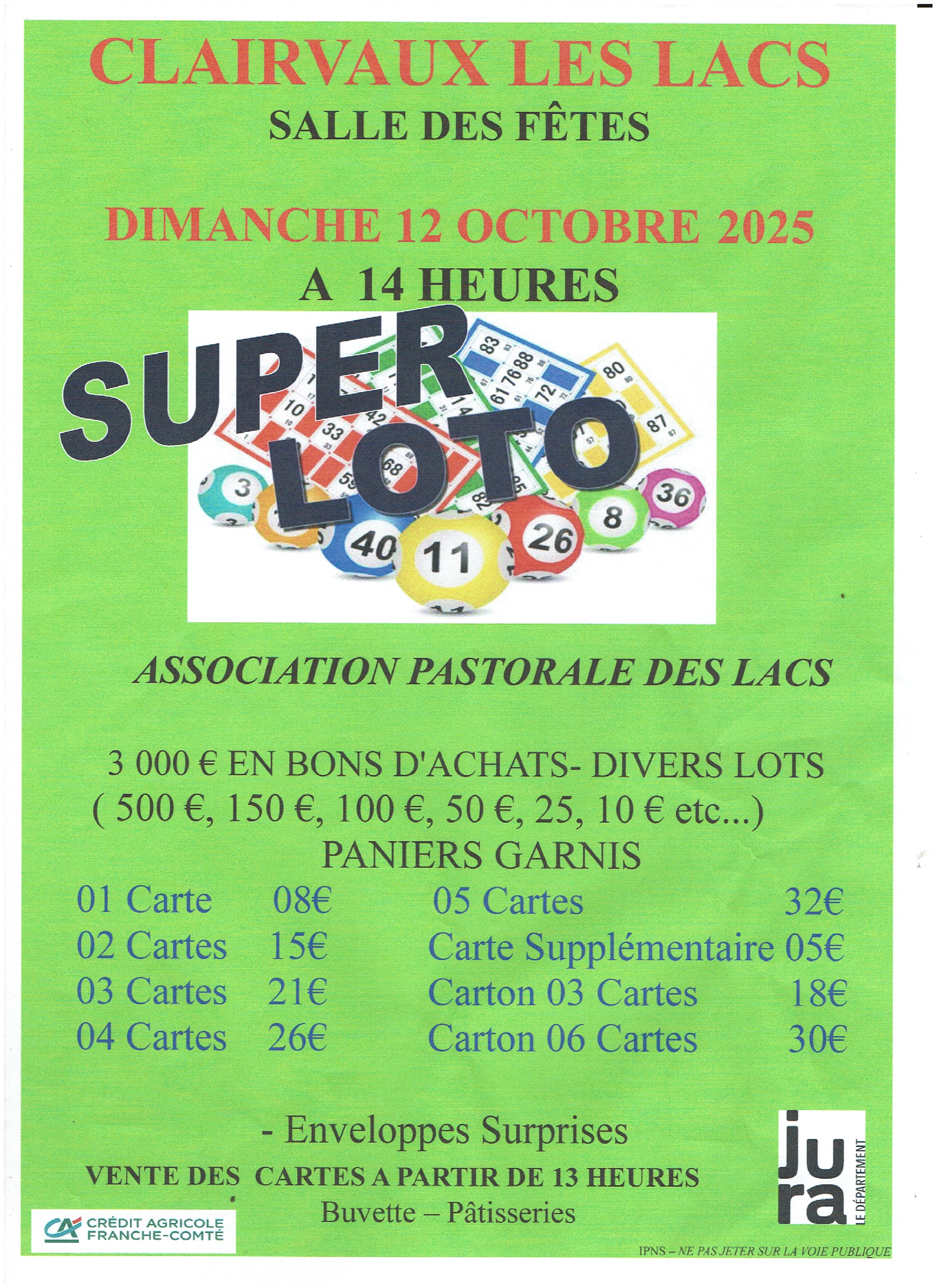 A la salle des fêtes à 14h. Organisé par l'Association Pastorale des Lacs. Vente des cartes à 13h. 3000€ en bons d'achat. Divers lots (de 10€ à 500€ etc), paniers garnis. Dès 8€/carte. Enveloppes surprises. Buvette, pâtisseries.