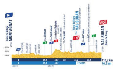 La course femme arrive aux environs de 12h45 à Saint Julien par la route de Saint Amour, traverse le village de St Julien, passe par Montagna le Templier, la côte de Villeneuve, Montfleur et rejoint l’arrivée à la salle des fêtes de St Julien par la route départementale n°117 (boucle) aux environs de 13 h 30.