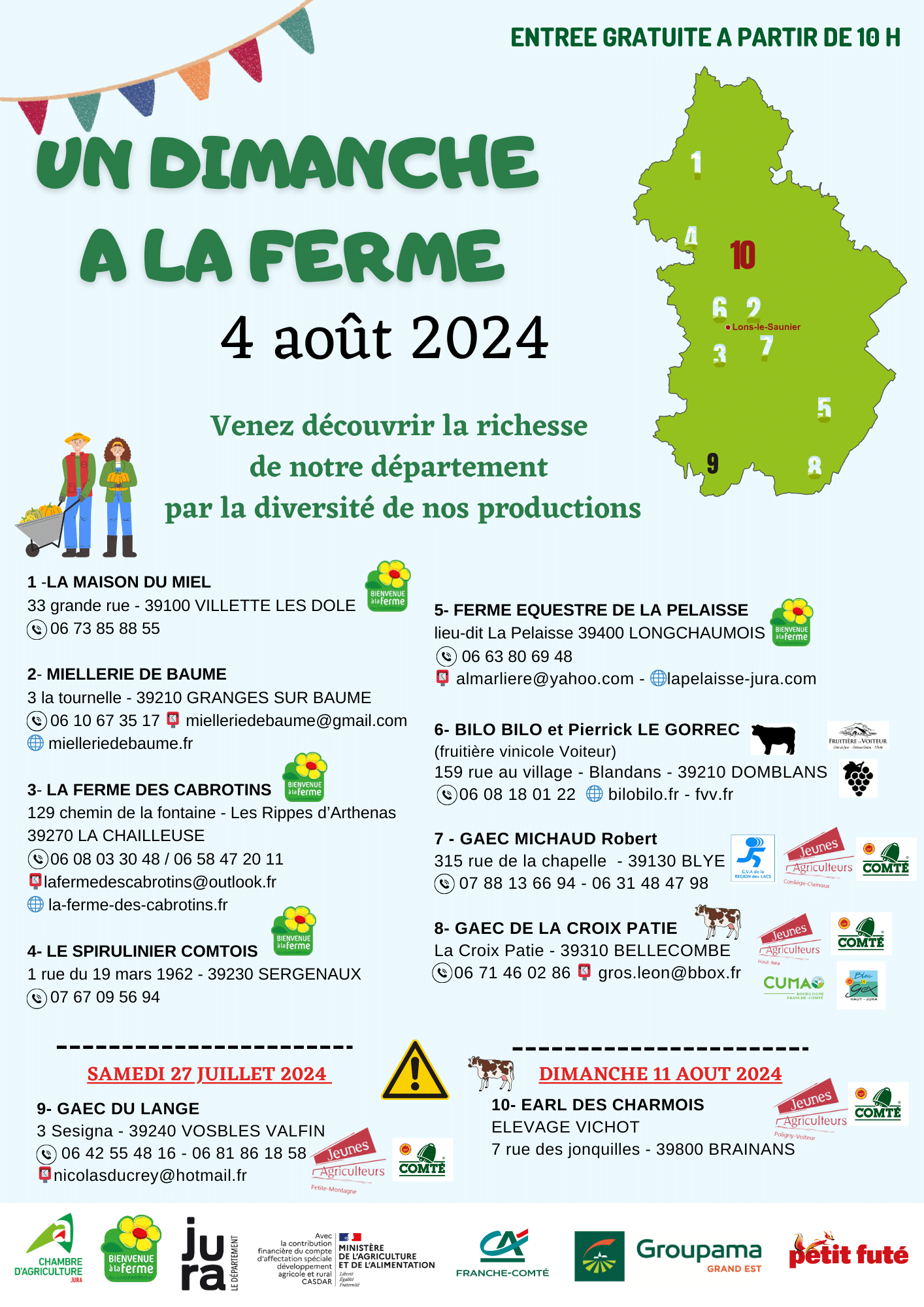 Visite de la ferme, repas buvette, circuits petits tracteurs enfant, piscine à foin, concours dessin, petit marché producteurs, dégustation vente de Comté.