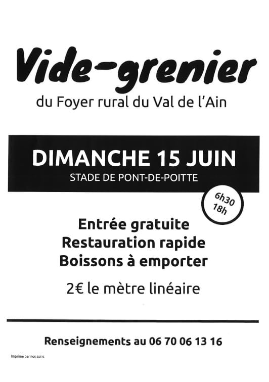 Vide grenier le 15 juin au stade de foot de Pont-de-Poitte de 06h30 à 18h00. Entrée gratuite.