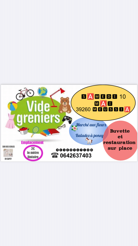 Vide-grenier, marché aux fleurs et balades à poney le 10 mai sur le parking de l'école de Meussia de 6h00 à 18h00.