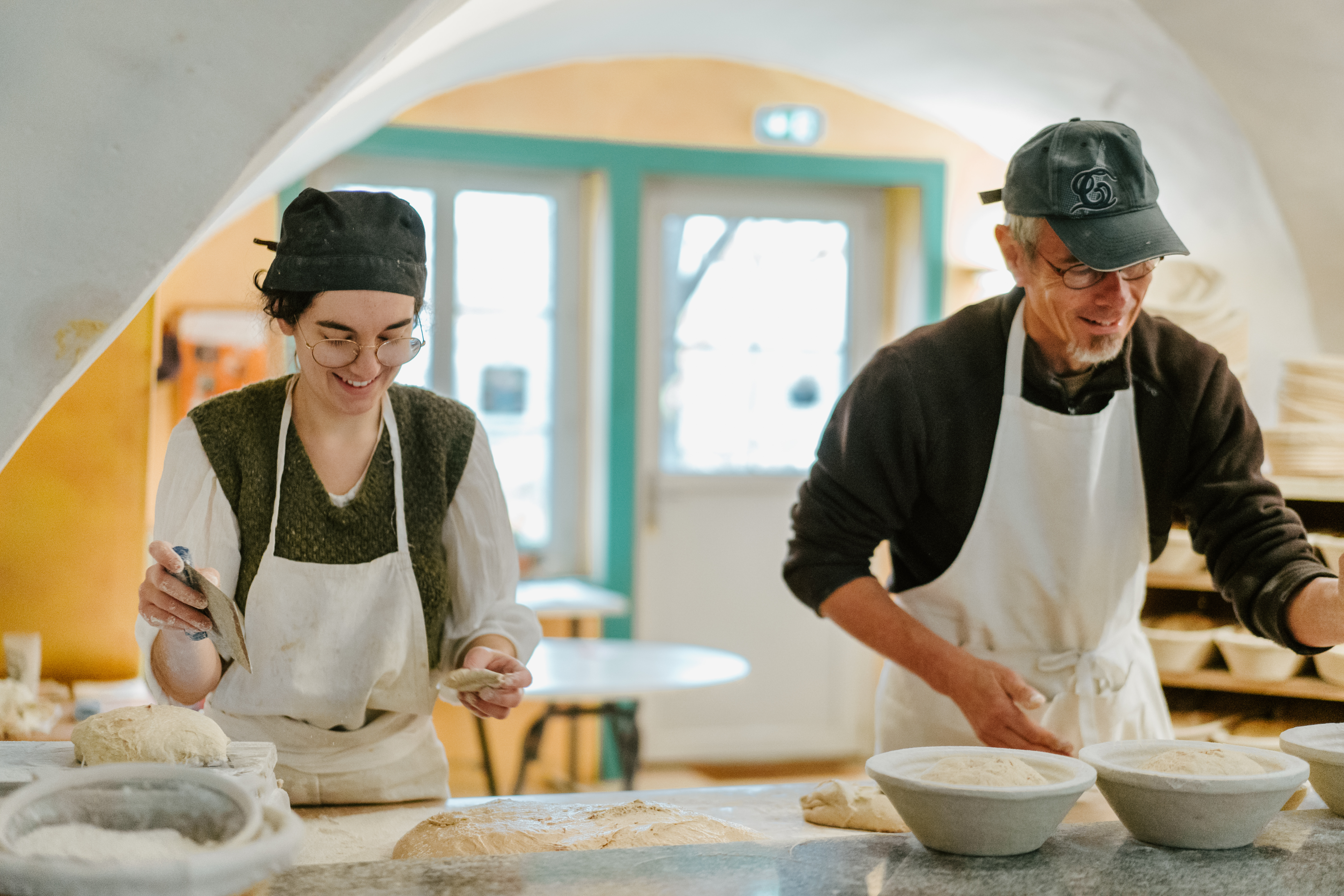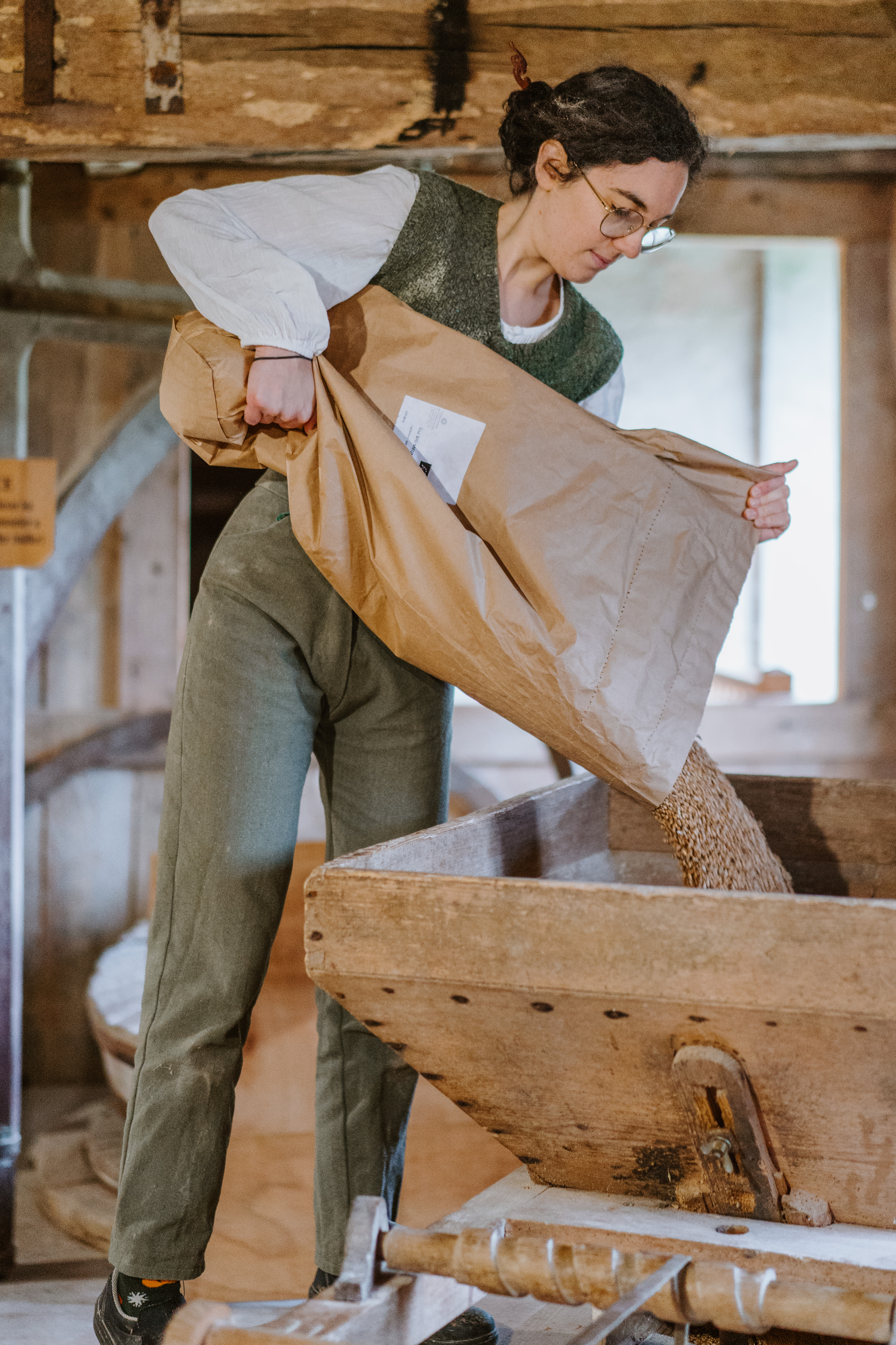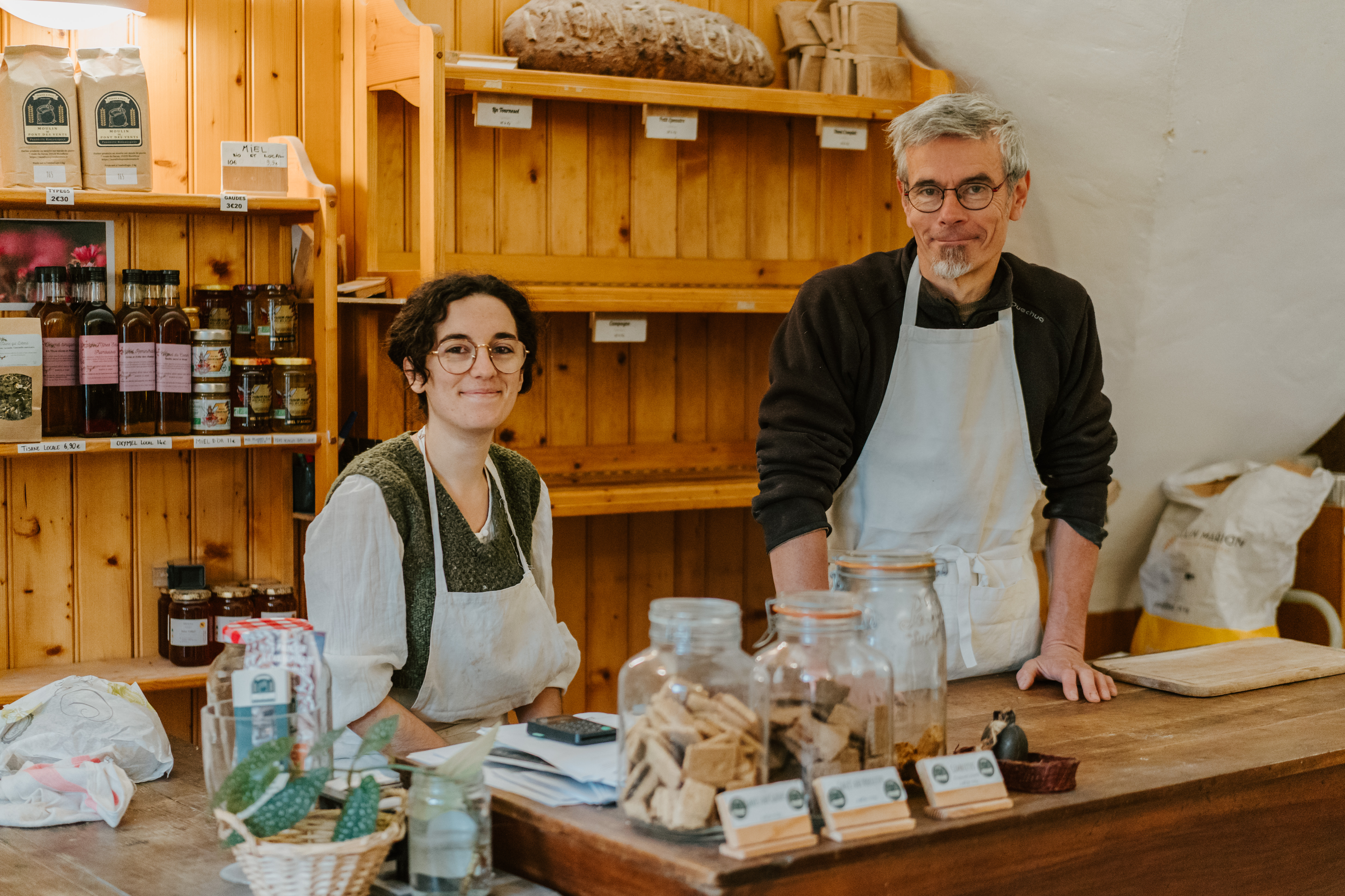 Nous fabriquons sur meules de pierre entrainées par l'eau des farines de blé bio et de gaudes que nous proposons à la vente. Avec ces farines nous fabriquons du pain à l'ancienne : pétri à la main au pur levain naturel et cuit sur place au feu de bois. Dans notre four cuit aussi une gamme de sablés (aux gaudes!) et de pâtisseries variables selon les saisons. Boulangers à la maison en quête de bonne farine, amateurs de bons pains et gourmands nostalgiques, venez trouver votre bonheur!