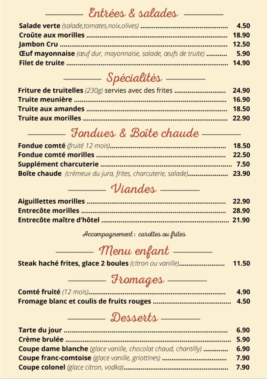 Vous dégusterez notre cuisine régionale maison et nos spécialités comme les truites fraîches pêchées dans le vivier.